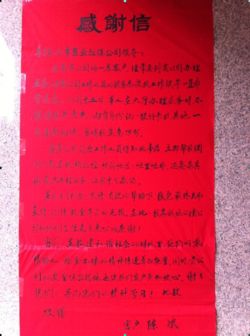 工作人員的熱情細致的服務態(tài)度,給陳斌先生及家人留下深刻印象。事后,為了表達感激之情,陳先生送來親筆抒寫的感謝信,寫道:“在構建和諧社會的時代里,他們以熱情助人,拾金不昧的精神傳遞著正能量!同時,安慶市房屋置業(yè)擔保公司的安全保衛(wèi)措施也使我們客戶更加放心!”